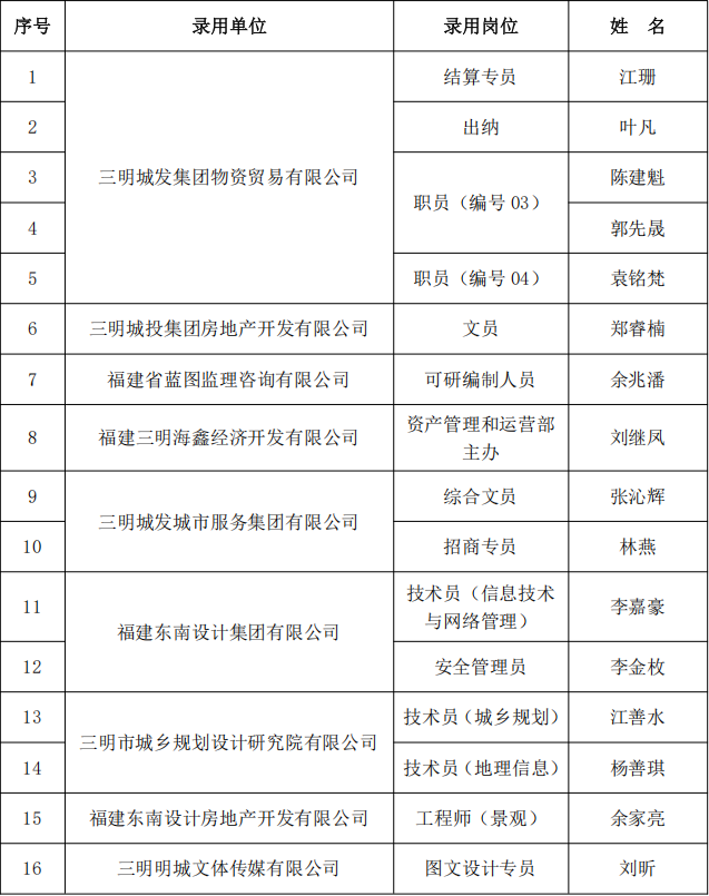 根据市城发集团2025年4月17日发布的招聘公告,通过报名、资格审查、面试、笔试等程序,现将拟录用人员名单公示如下: